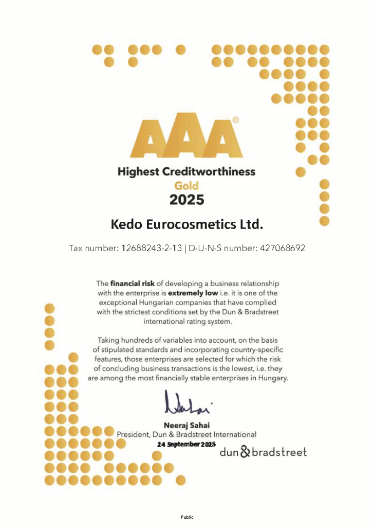 A Kedo Eurocosmetics Kft. a  Dun & Bradstreet AAA (tripla A) Tanúsítványát kapta meg, mely azt jelzi, hogy velünk történő üzleti kapcsolat kialakításának pénzügyi kockázata rendkívül alacsony.